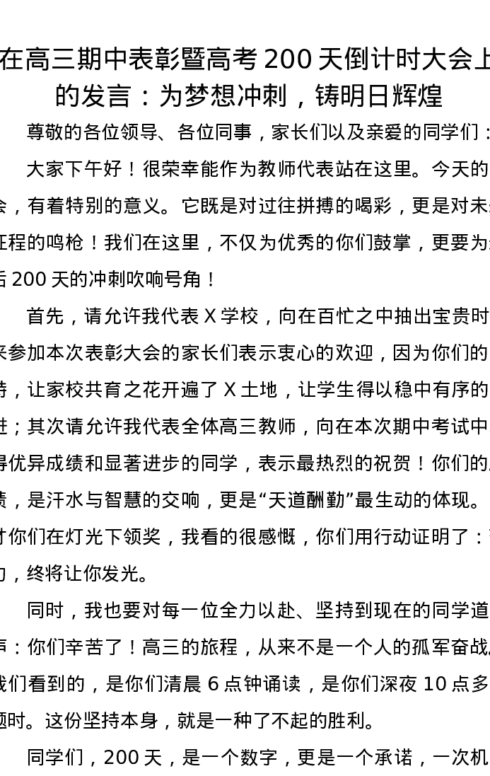 在高三期中表彰暨高考200天倒计时大会上的发言:为梦想冲刺,铸明日辉煌