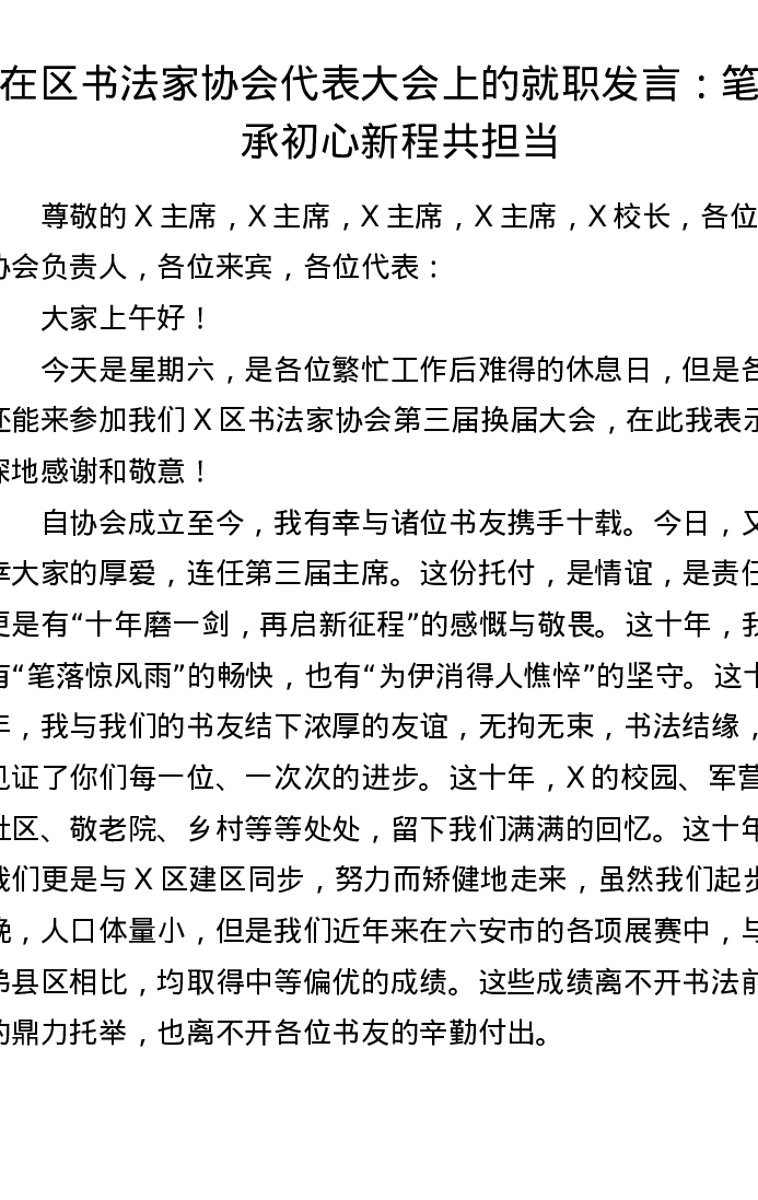 在区书法家协会代表大会上的就职发言:笔墨承初心新程共担当