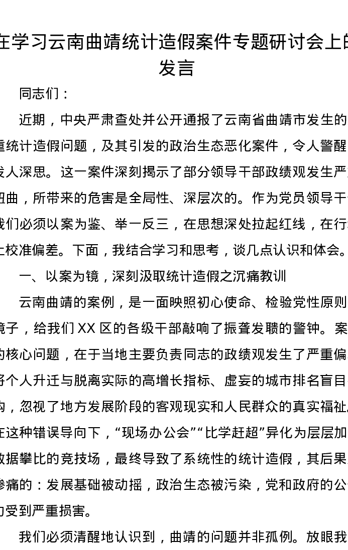 在学习云南曲靖统计造假案件专题研讨会上的发言