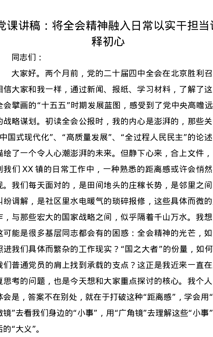 党课讲稿:将全会精神融入日常 以实干担当诠释初心