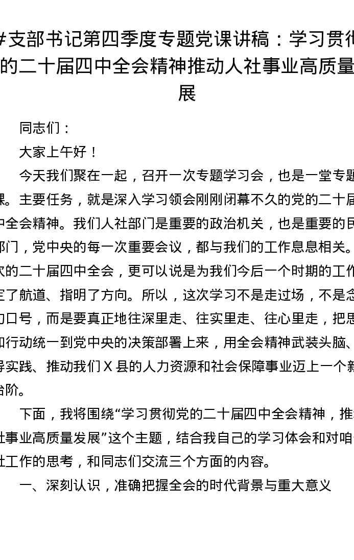 支部书记专题党课讲稿:学习贯彻党的二十届四中全会精神推动人社事业高质量发展