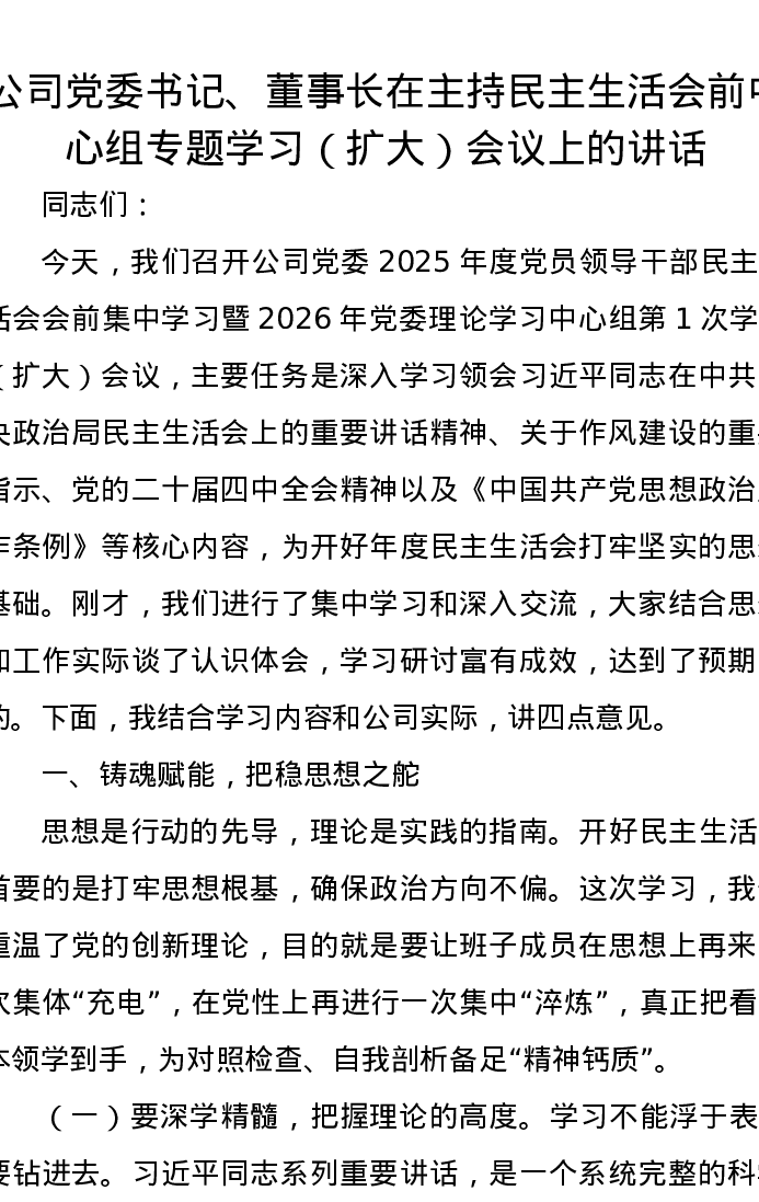 公司党委书记、董事长在主持xxxxx前中心组专题学习(扩大)会议上的讲话