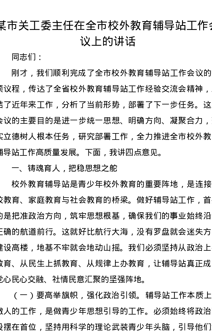 某市关工委主任在全市校外教育辅导站工作会议上的讲话