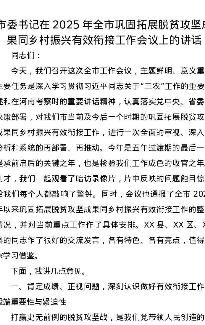市委书记在2025年全市巩固拓展脱贫攻坚成果同乡村振兴有效衔接工作会议上的讲话