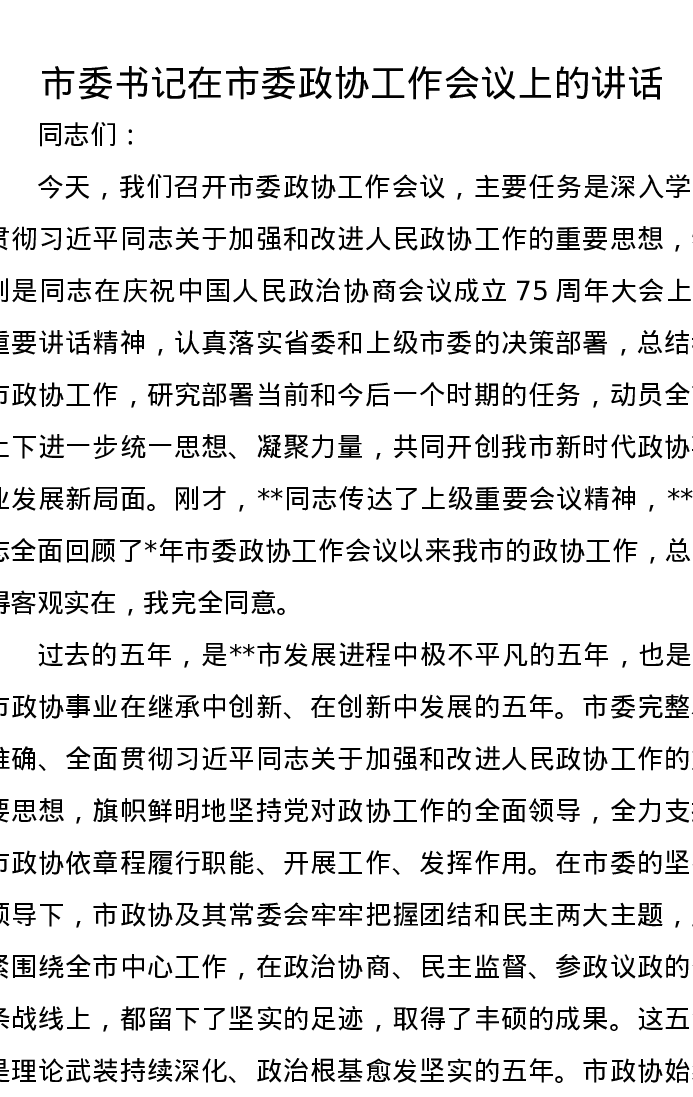 市委书记在市委政协工作会议上的讲话