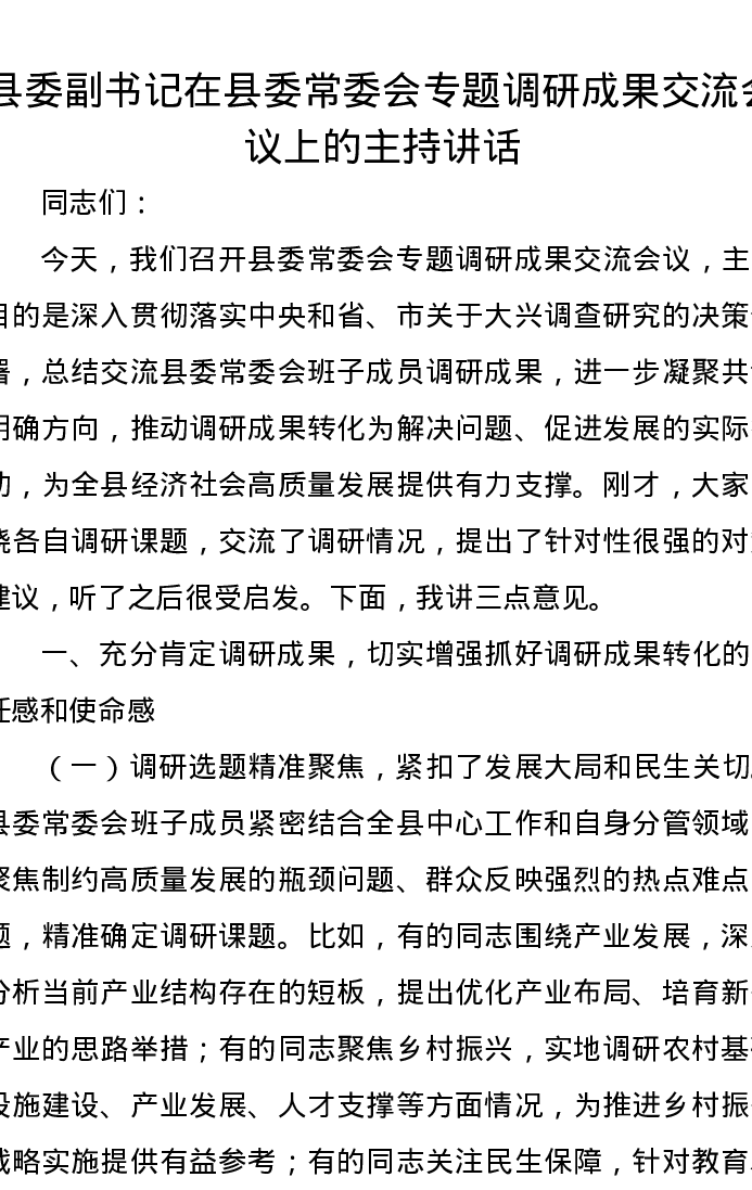 县委副书记在县委常委会专题调研成果交流会议上的主持讲话
