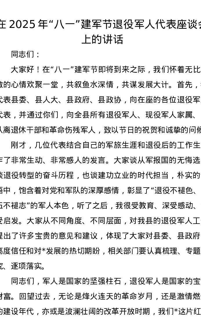 在2025年八一建军节退役军人代表座谈会上的讲话