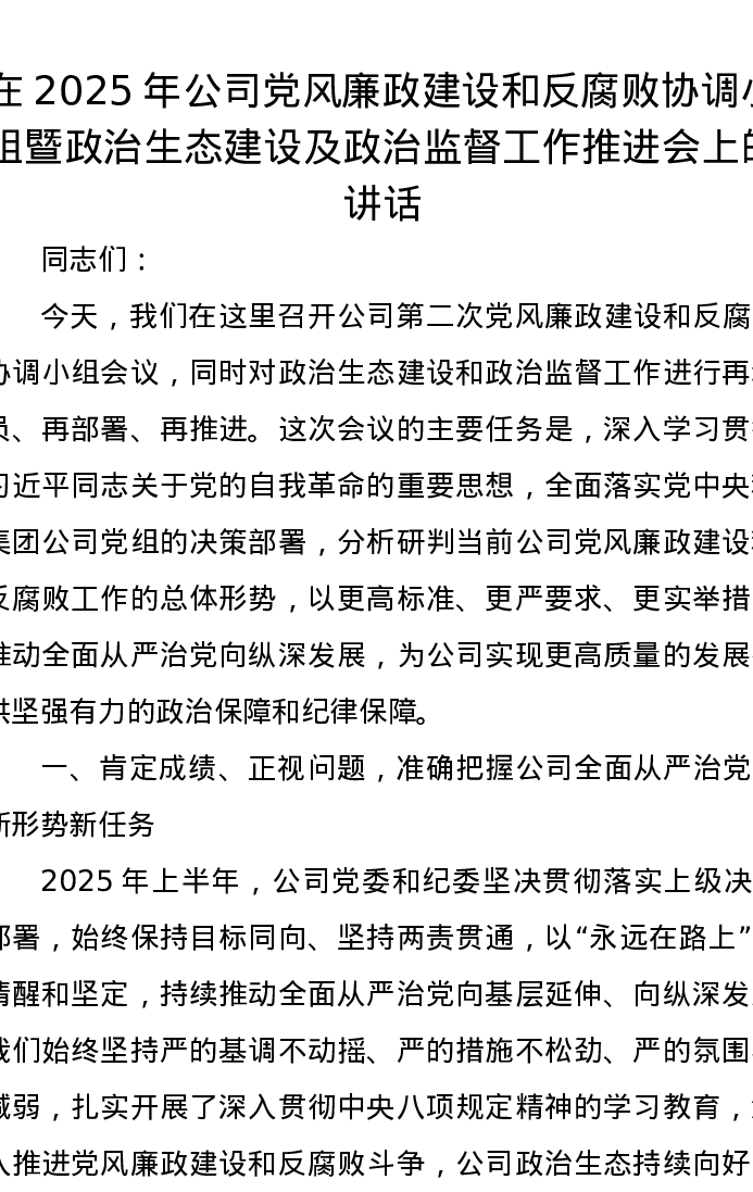 在2025年公司党风廉政建设和反腐败协调小组暨政治生态建设及政治监督工作推进会上的讲话