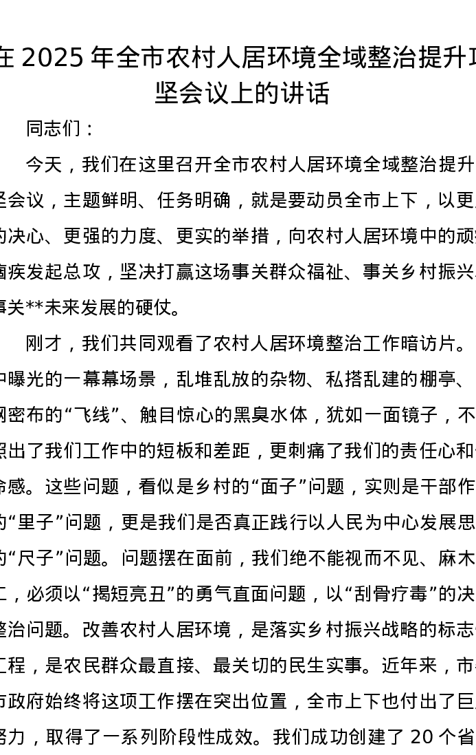 在2025年全市农村人居环境全域整治提升攻坚会议上的讲话
