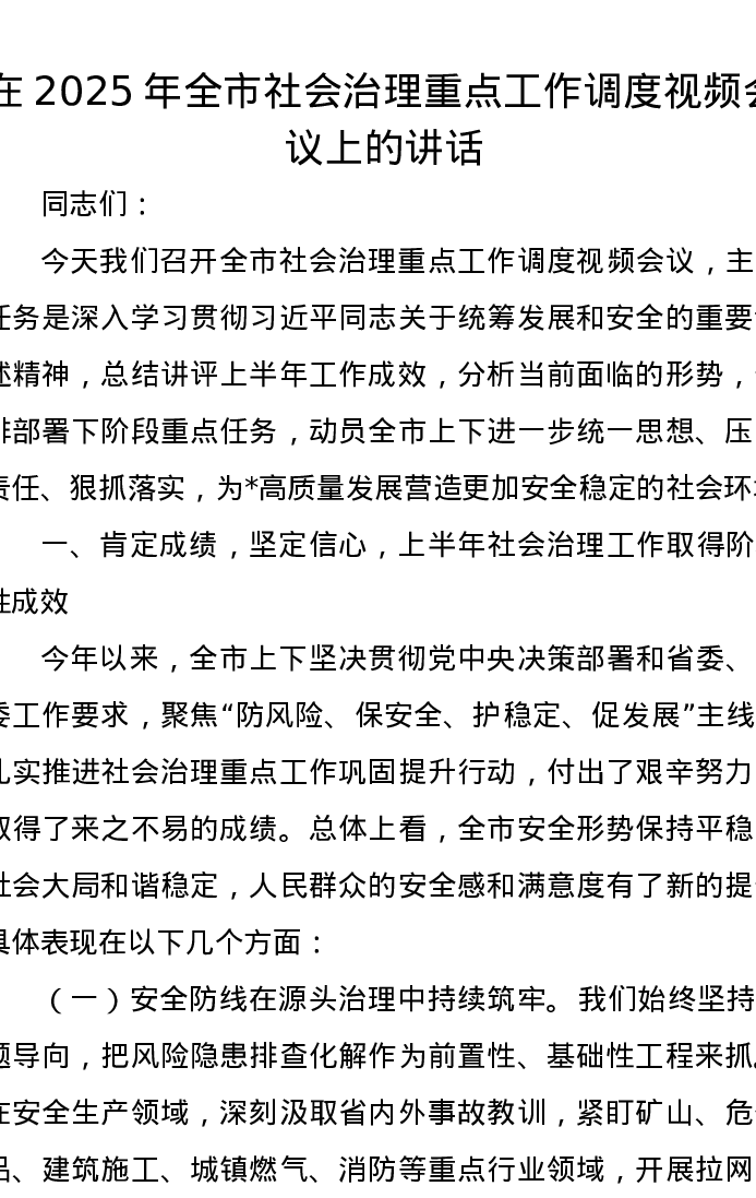 在2025年全市社会治理重点工作调度视频会议上的讲话