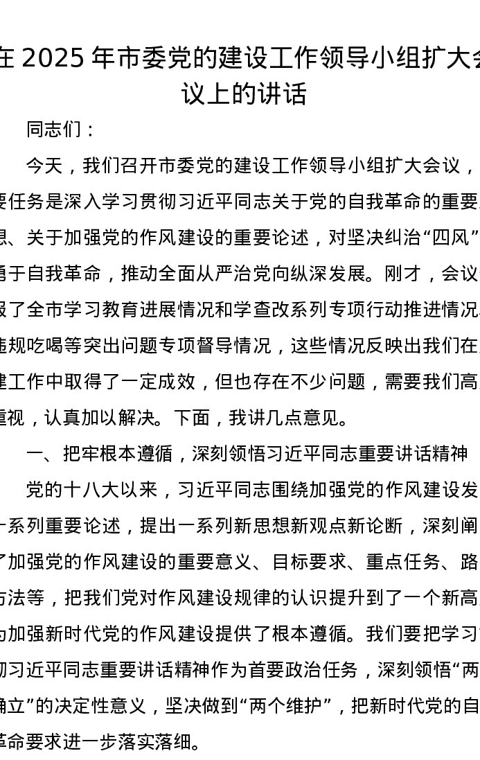 在2025年市委党的建设工作领导小组扩大会议上的讲话