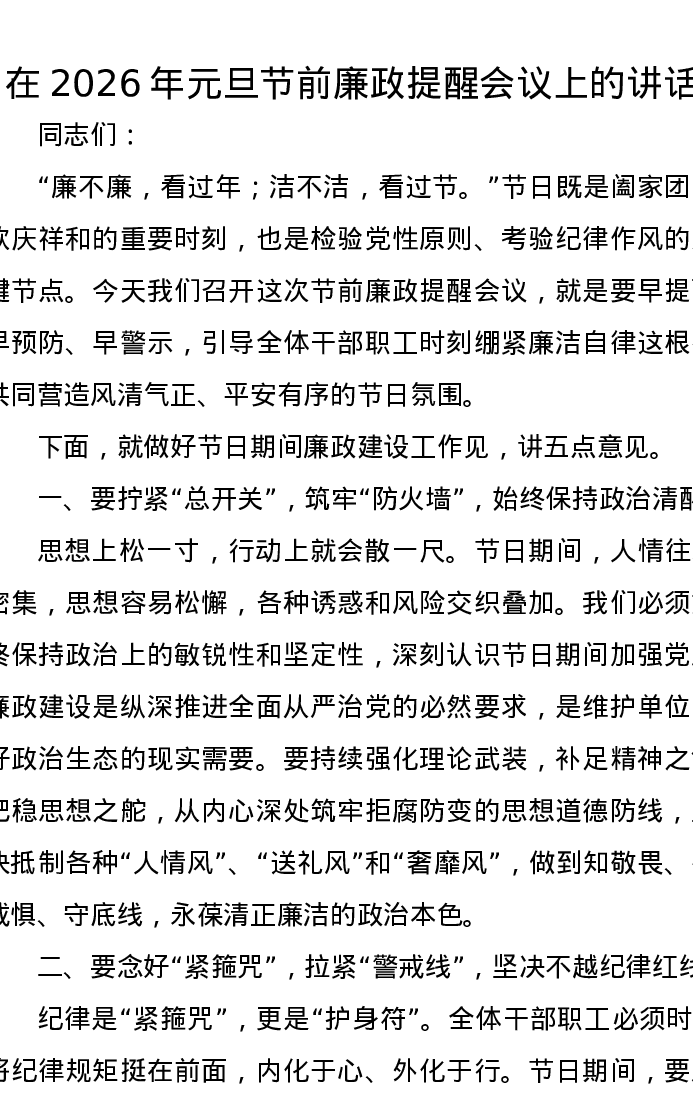 在2026年元旦节前廉政提醒会议上的讲话