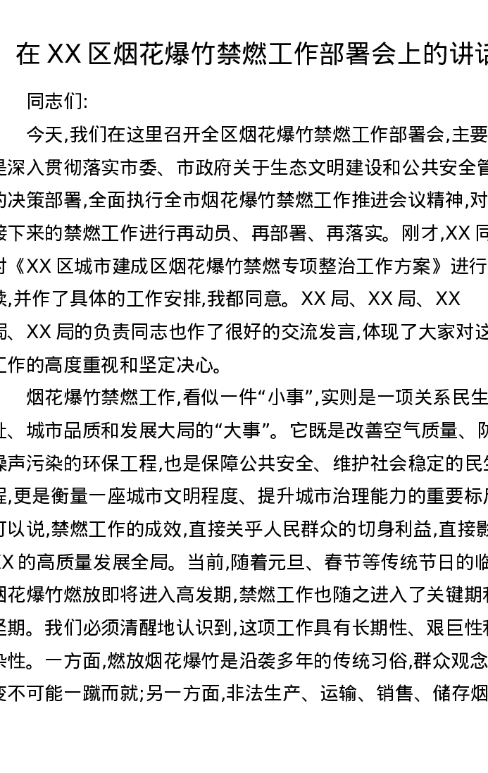 在XX区烟花爆竹禁燃工作部署会上的讲话