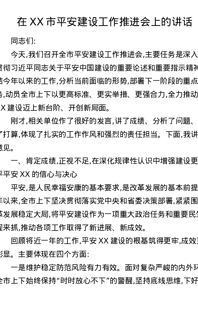 在XX市平安建设工作推进会上的讲话