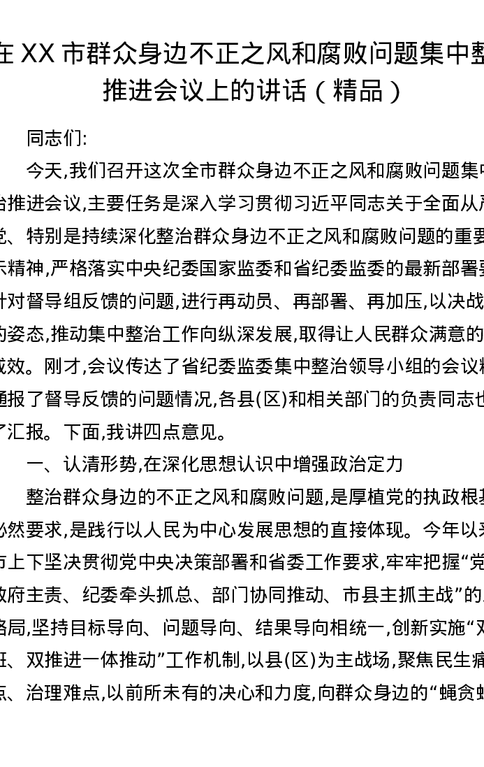 在XX市群众身边不正之风和腐败问题集中整治推进会议上的讲话