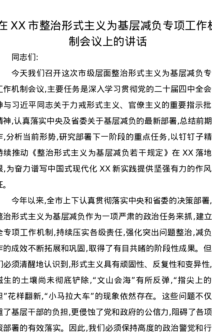 在XX市整治形式主义为基层减负专项工作机制会议上的讲话2