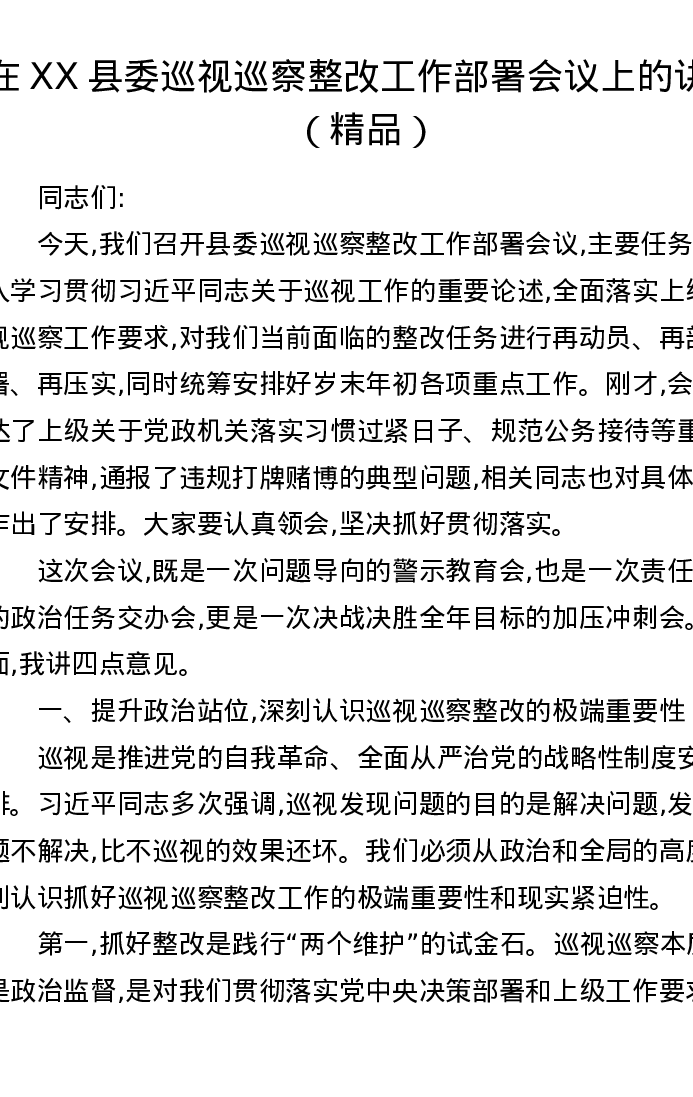 在XX县委巡视巡察整改工作部署会议上的讲话