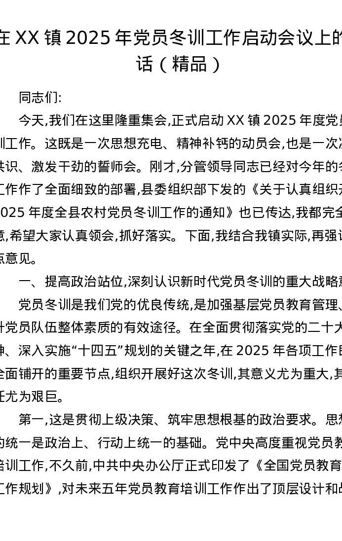 在XX镇2025年党员冬训工作启动会议上的讲话
