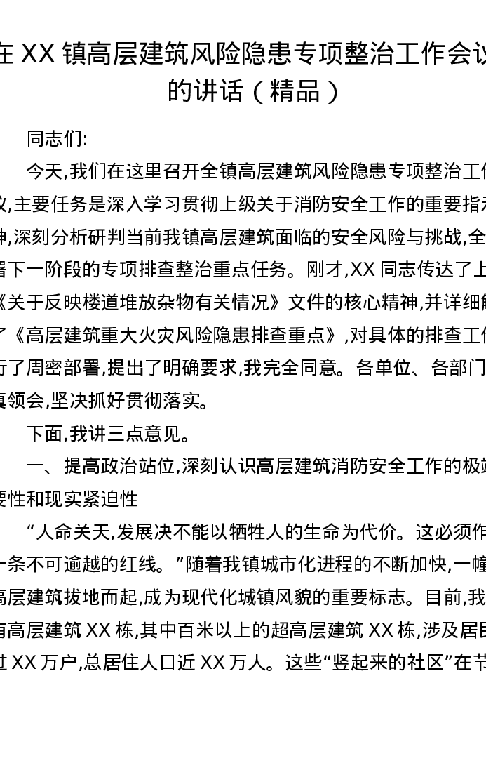 在XX镇高层建筑风险隐患专项整治工作会议上的讲话