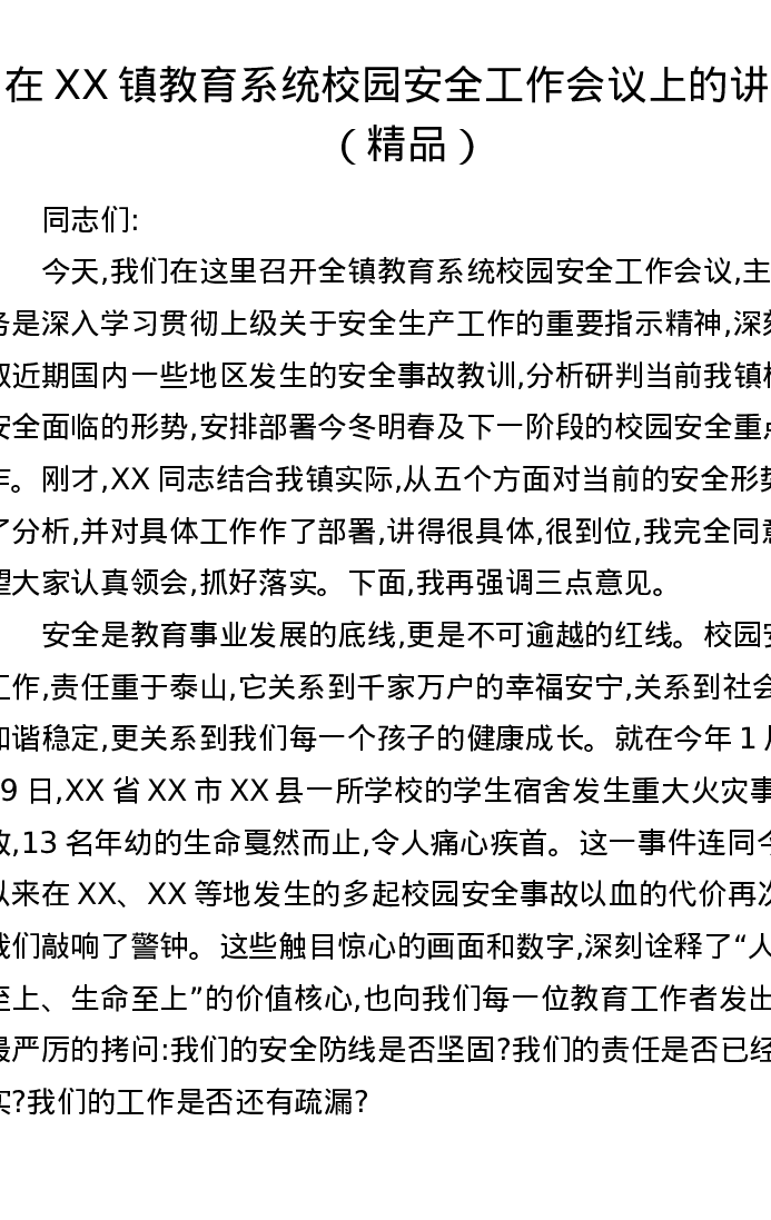 在XX镇教育系统校园安全工作会议上的讲话