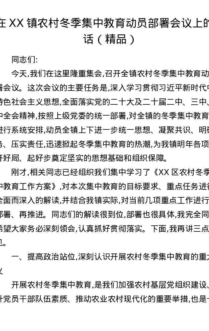 在XX镇农村冬季集中教育动员部署会议上的讲话