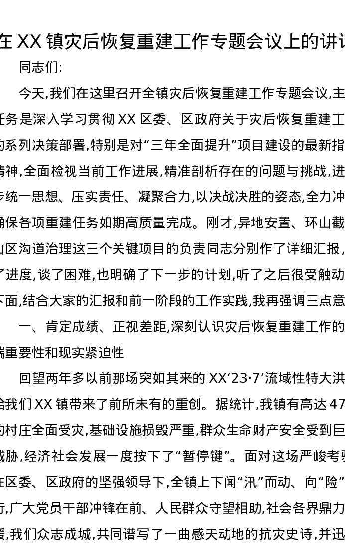 在XX镇灾后恢复重建工作专题会议上的讲话