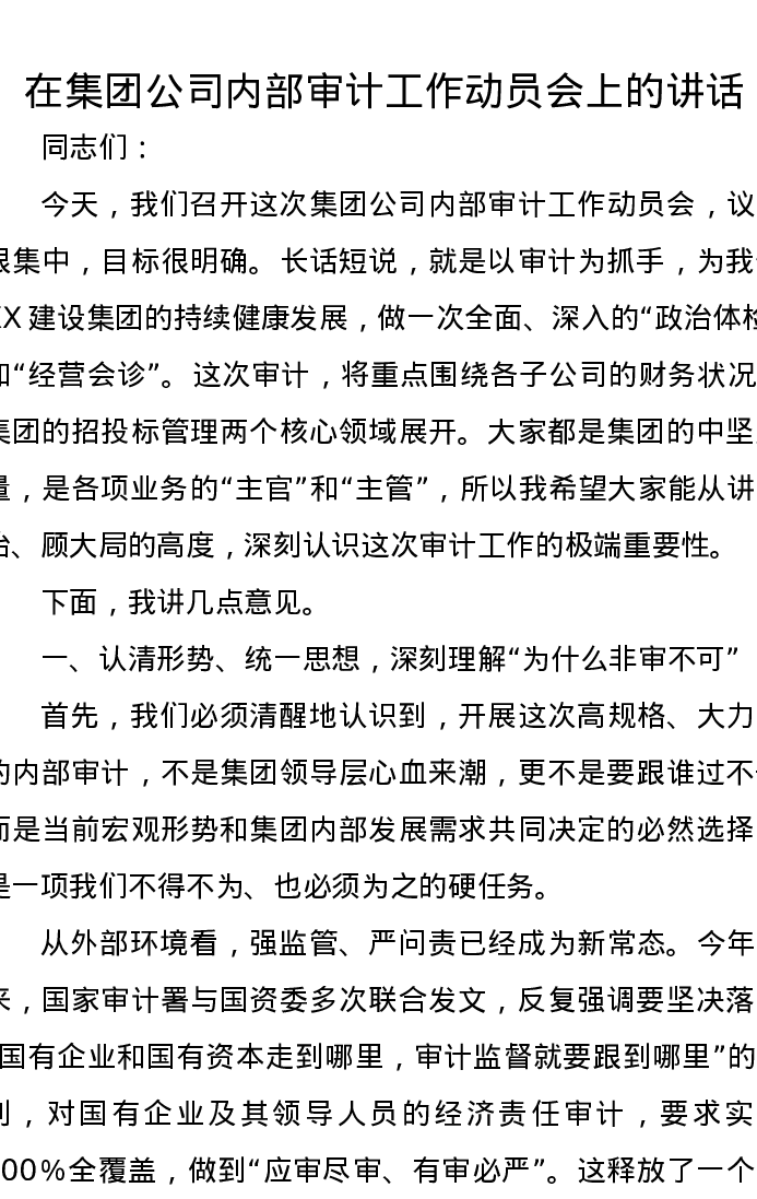在集团公司内部审计工作动员会上的讲话