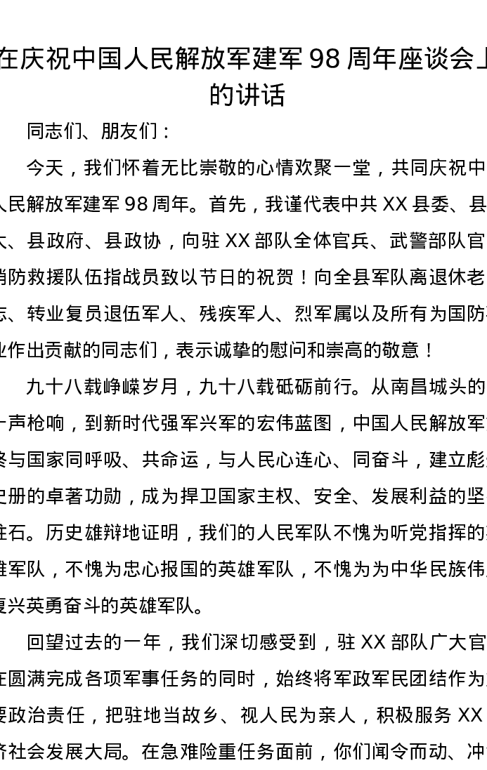 在庆祝中国人民解放军建军98周年座谈会上的讲话