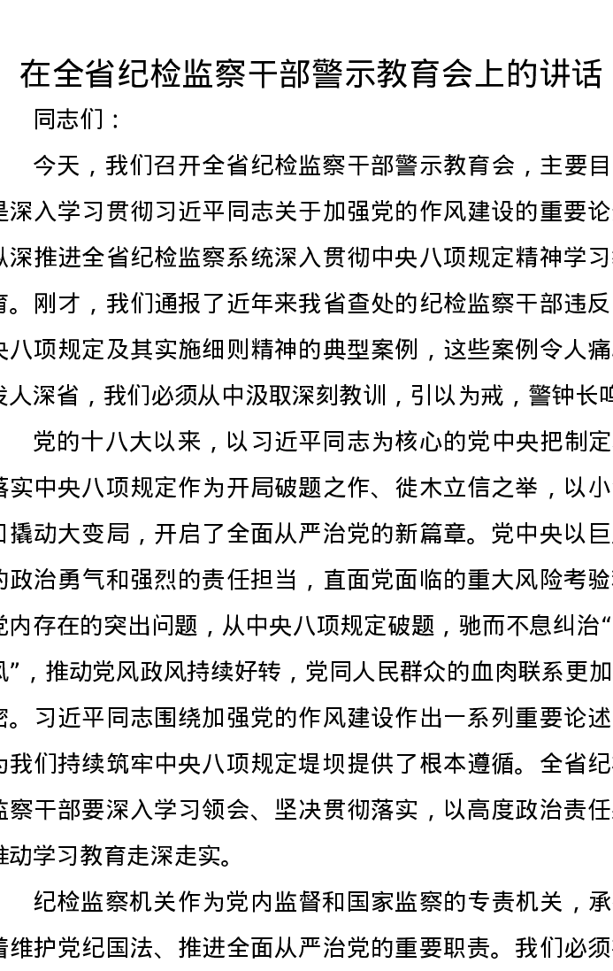 在全省纪检监察干部警示教育会上的讲话
