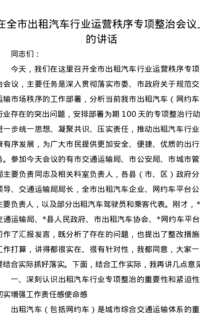 在全市出租汽车行业运营秩序专项整治会议上的讲话