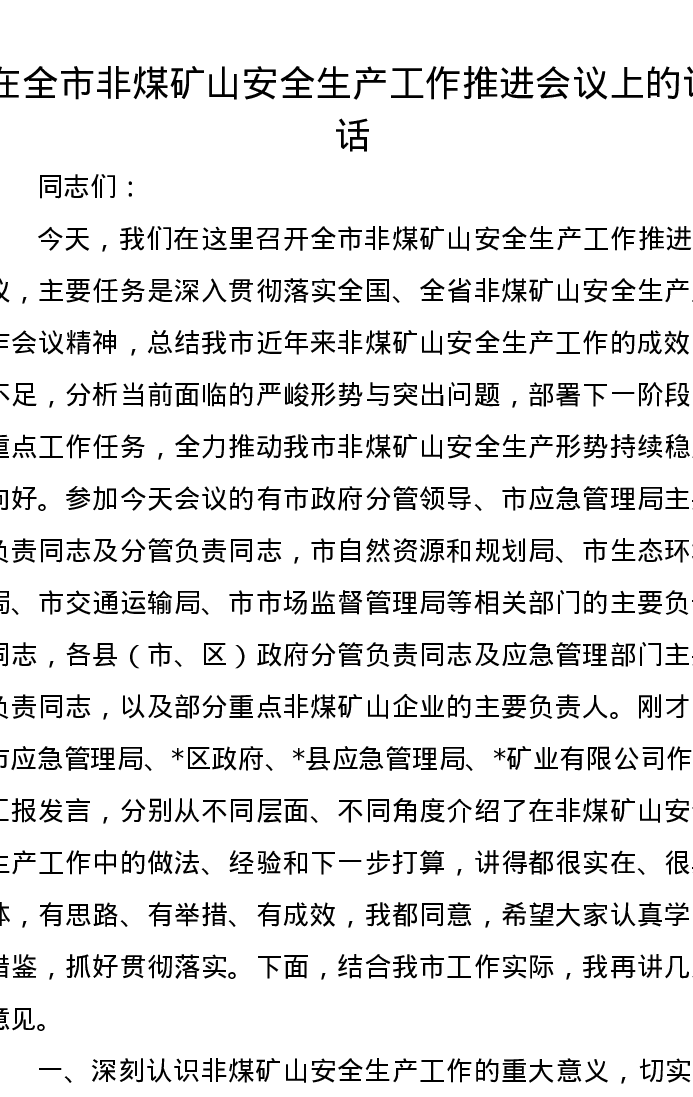 在全市非煤矿山安全生产工作推进会议上的讲话
