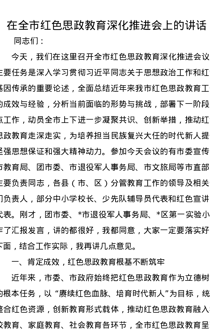 在全市红色思政教育深化推进会上的讲话
