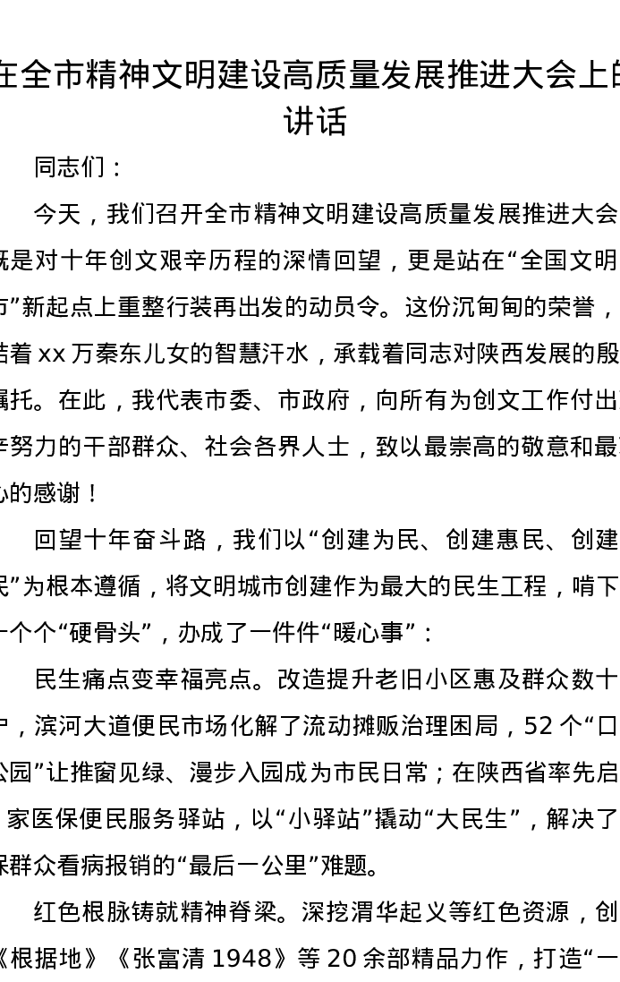 在全市精神文明建设高质量发展推进大会上的讲话