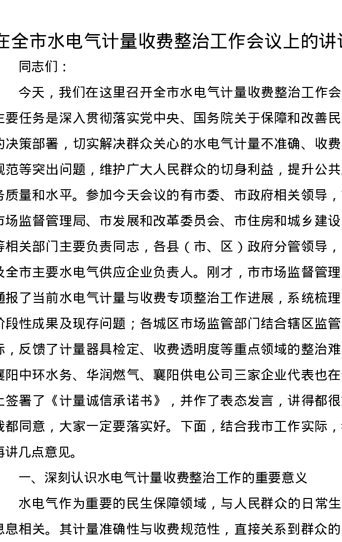 在全市水电气计量收费整治工作会议上的讲话