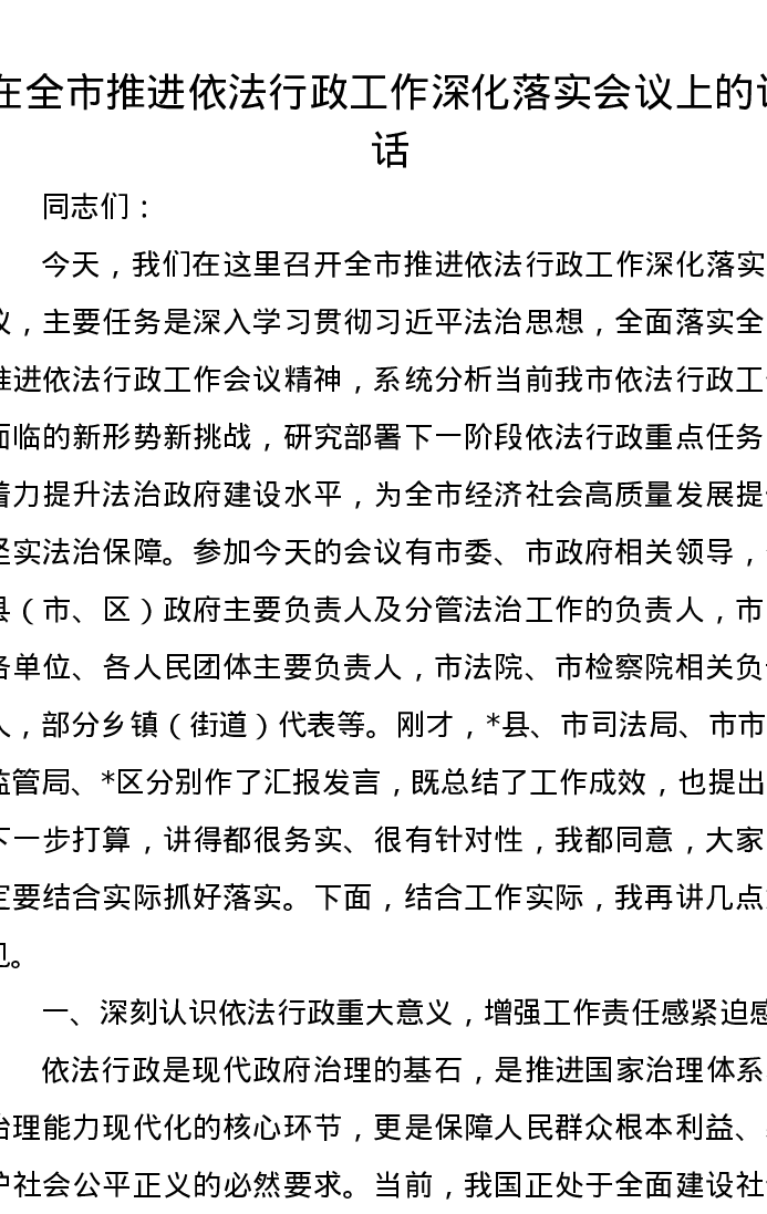 在全市推进依法行政工作深化落实会议上的讲话