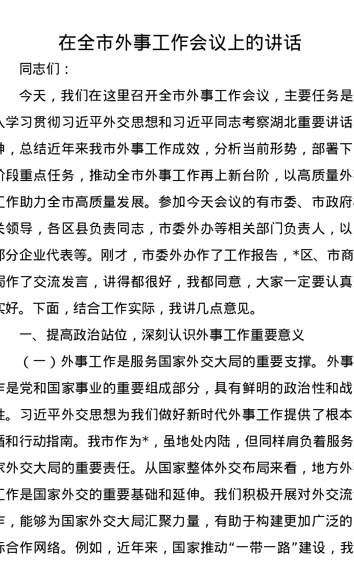 在全市外事工作会议上的讲话