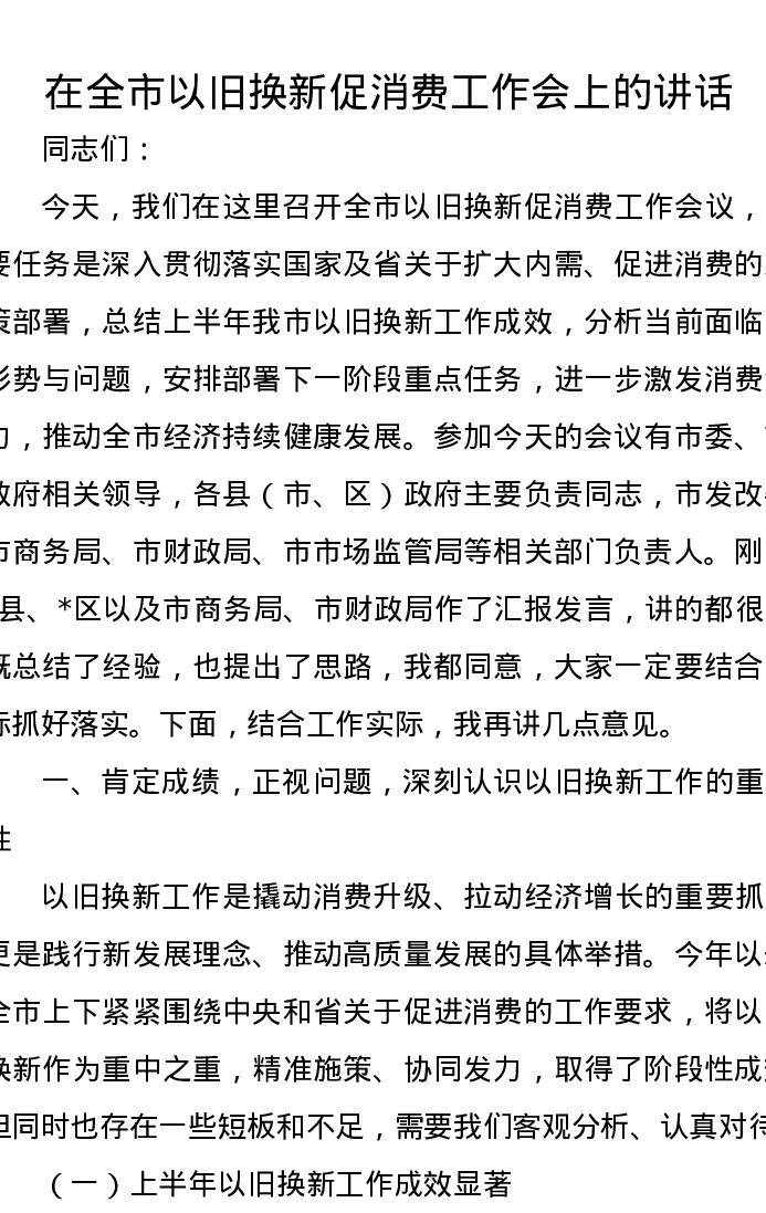 在全市以旧换新促消费工作会上的讲话