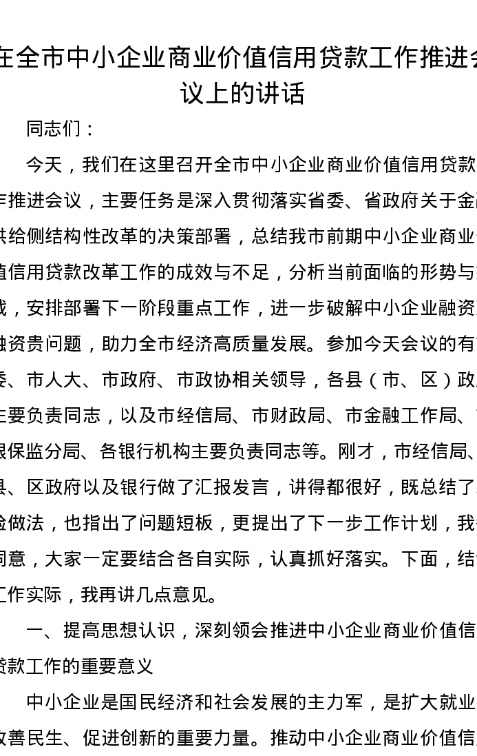 在全市中小企业商业价值信用贷款工作推进会议上的讲话