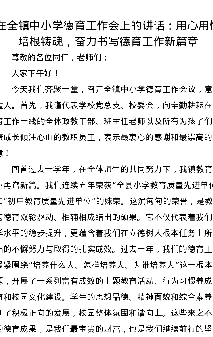 在全镇中小学德育工作会上的讲话:用心用情培根铸魂,奋力书写德育工作新篇章
