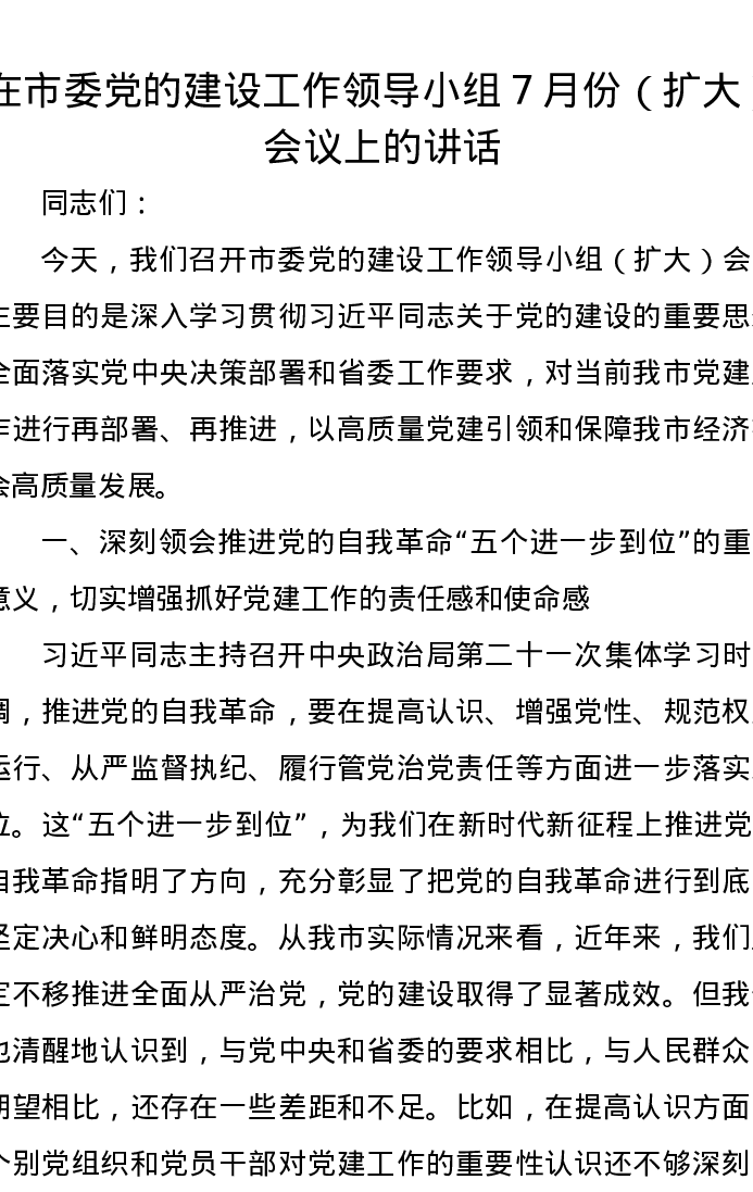 在市委党的建设工作领导小组7月份(扩大)会议上的讲话