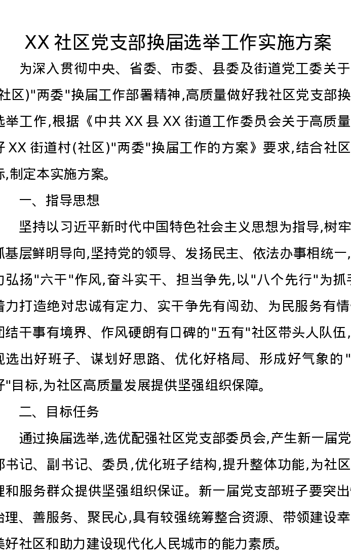 XX社区党支部换届选举工作实施方案