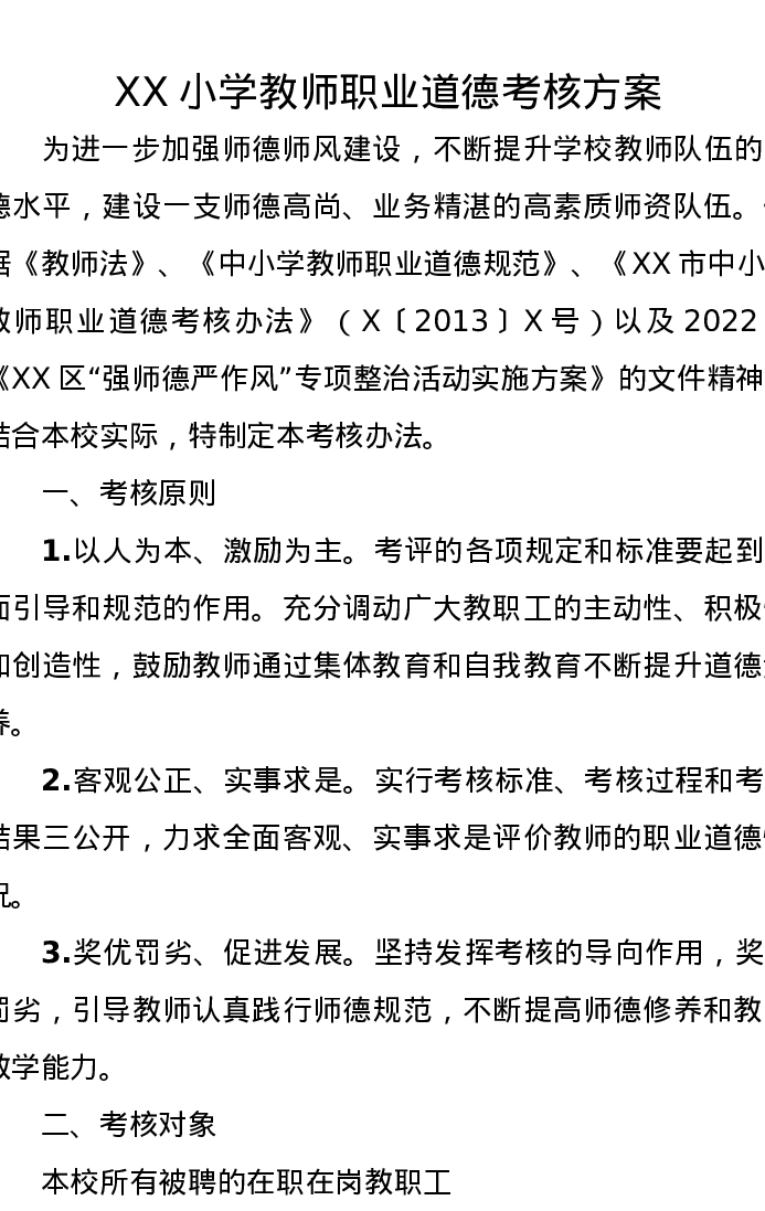 XX小学教师职业道德考核方案