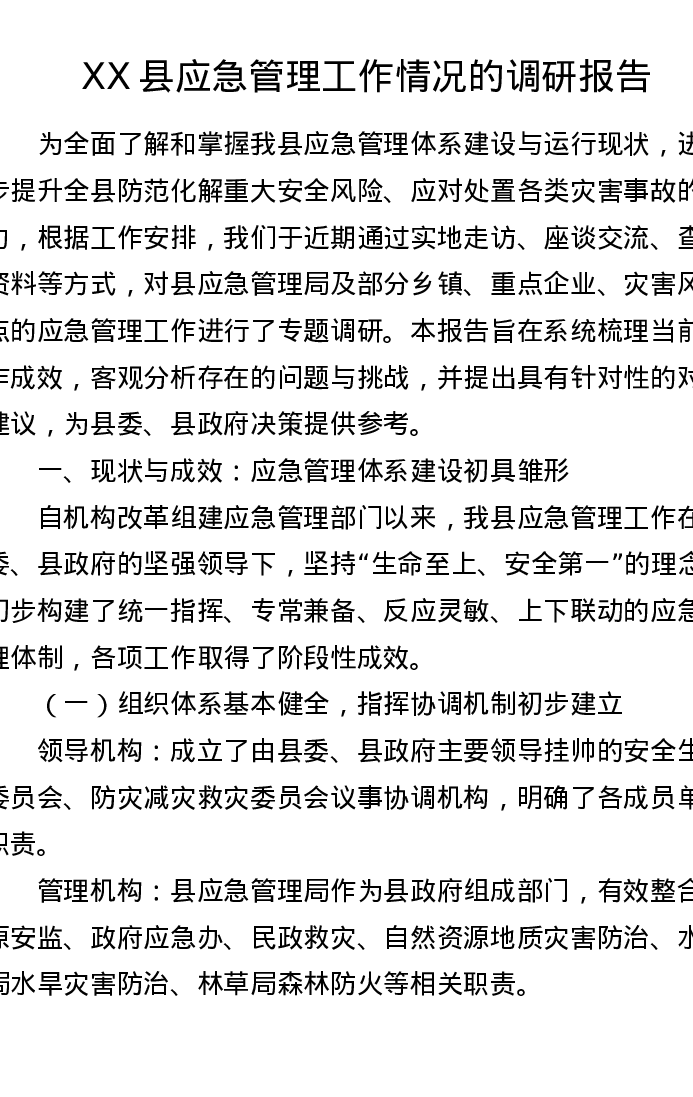 XX县应急管理工作情况的调研报告