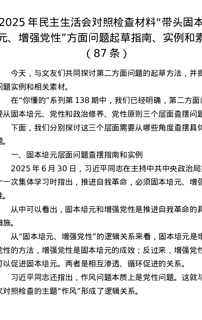 (87条)2025年xxxxx对照检查材料带头固本培元、增强党性方面问题起草指南、实例和素材