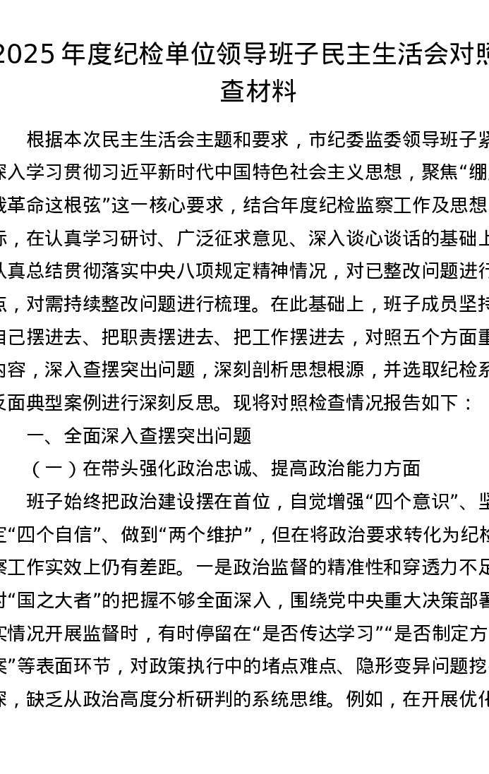 【原创】2025年度纪检单位领导班子五个带头xxxxx对照检查材料(7203字)