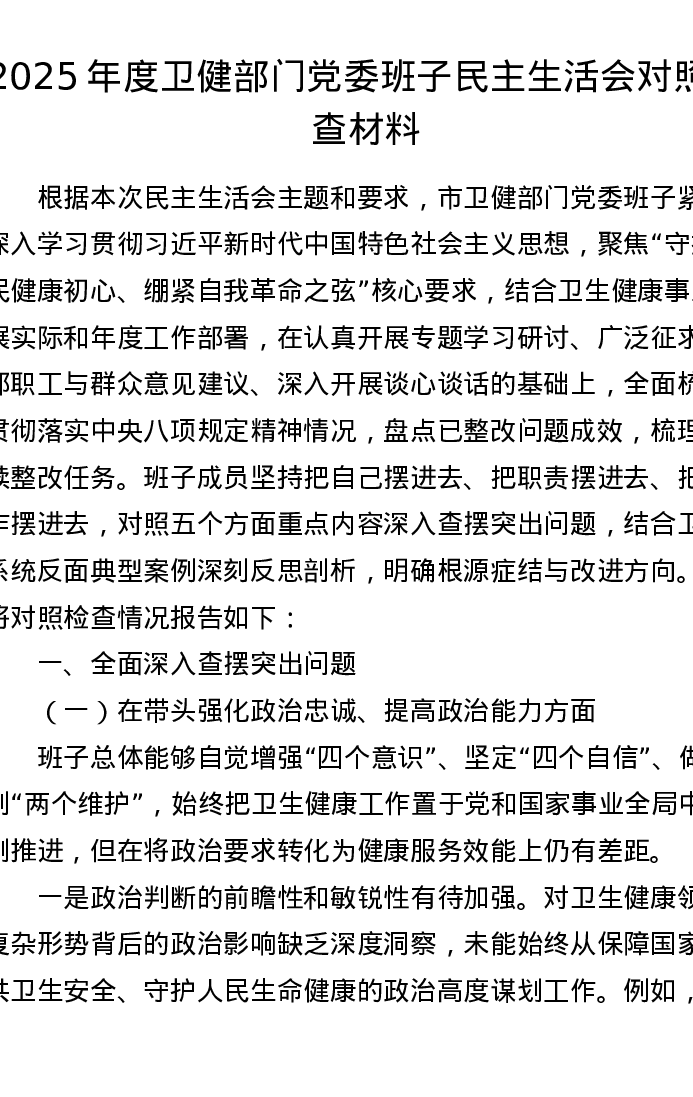 【原创】2025年度卫健部门党委班子五个带头xxxxx对照检查材料(7934字)