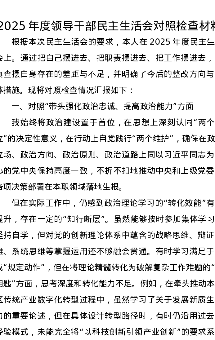 2025年度领导干部xxxxx对照检查材料(五个带头)
