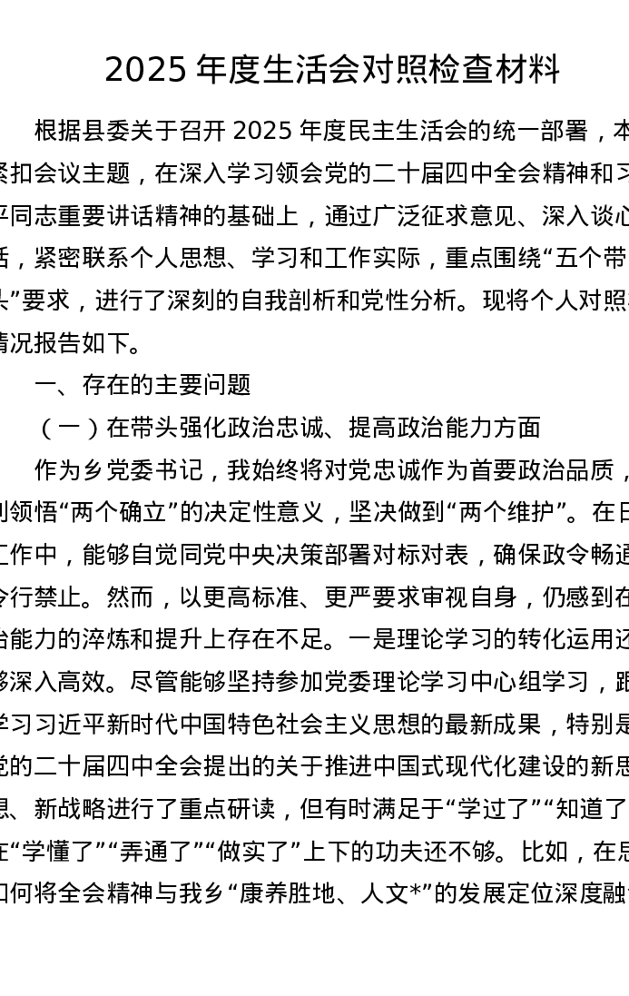 2025年度领导干部xxxxx对照检查材料2(五个带头)
