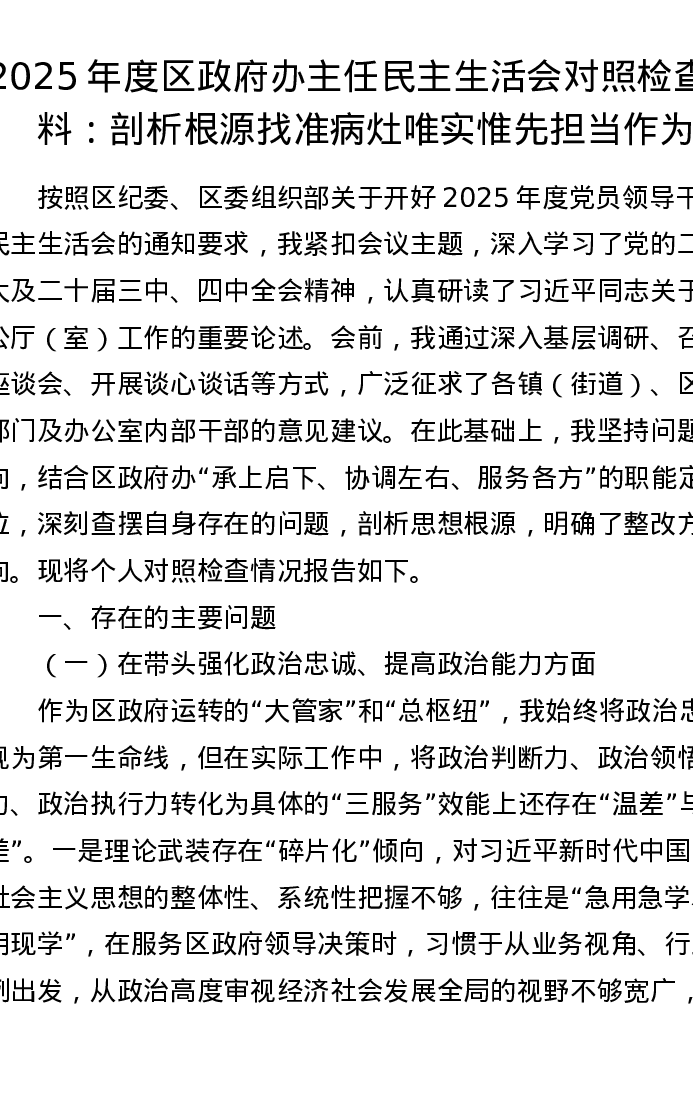 2025年度区政府办主任五个带头xxxxx对照检查材料:剖析根源找准病灶 唯实惟先担当作为