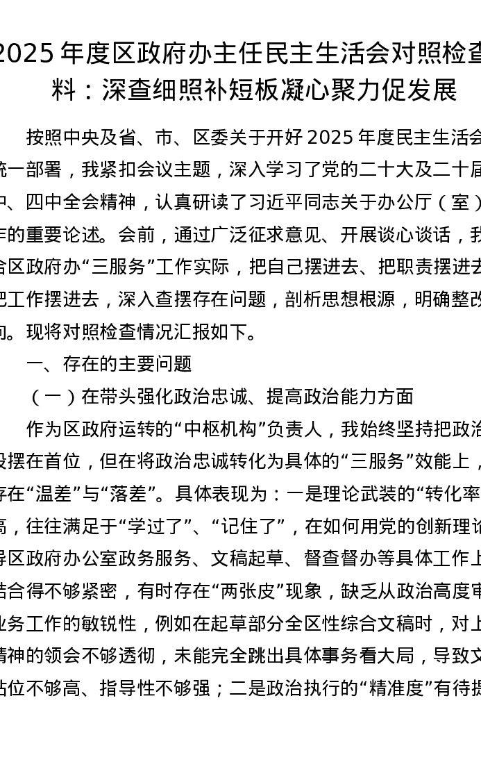 2025年度区政府办主任五个带头xxxxx对照检查材料:深查细照补短板 凝心聚力促发展